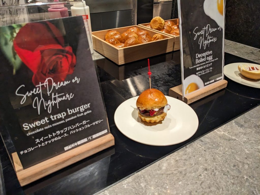 糖分摂りすぎて頭がクラクラしてきてるところに、隣の席に座った外人集団があろうことか突然メリケンスタイルなバーガー喰い始めて前のめりで見つめてしまいました。今一番喰いたいもの選手権余裕の第一位の食品が唐突に現れて夢でも見ているかと思いました。なんでハロウィン会場で喰ってんねん、普通のブースで喰ってくれや。まあ面白くて良かったですね。