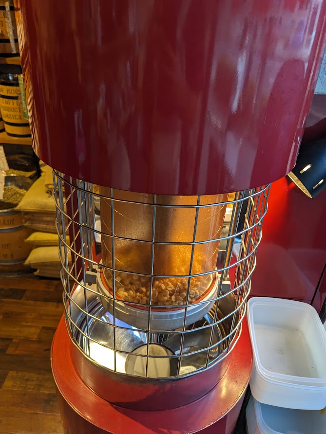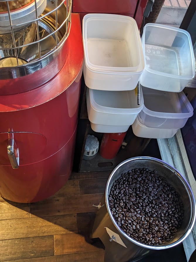 ひとしきりやったあとは近くの焙煎所でカフェオレ買ってQK。焙煎機は癒やし。
