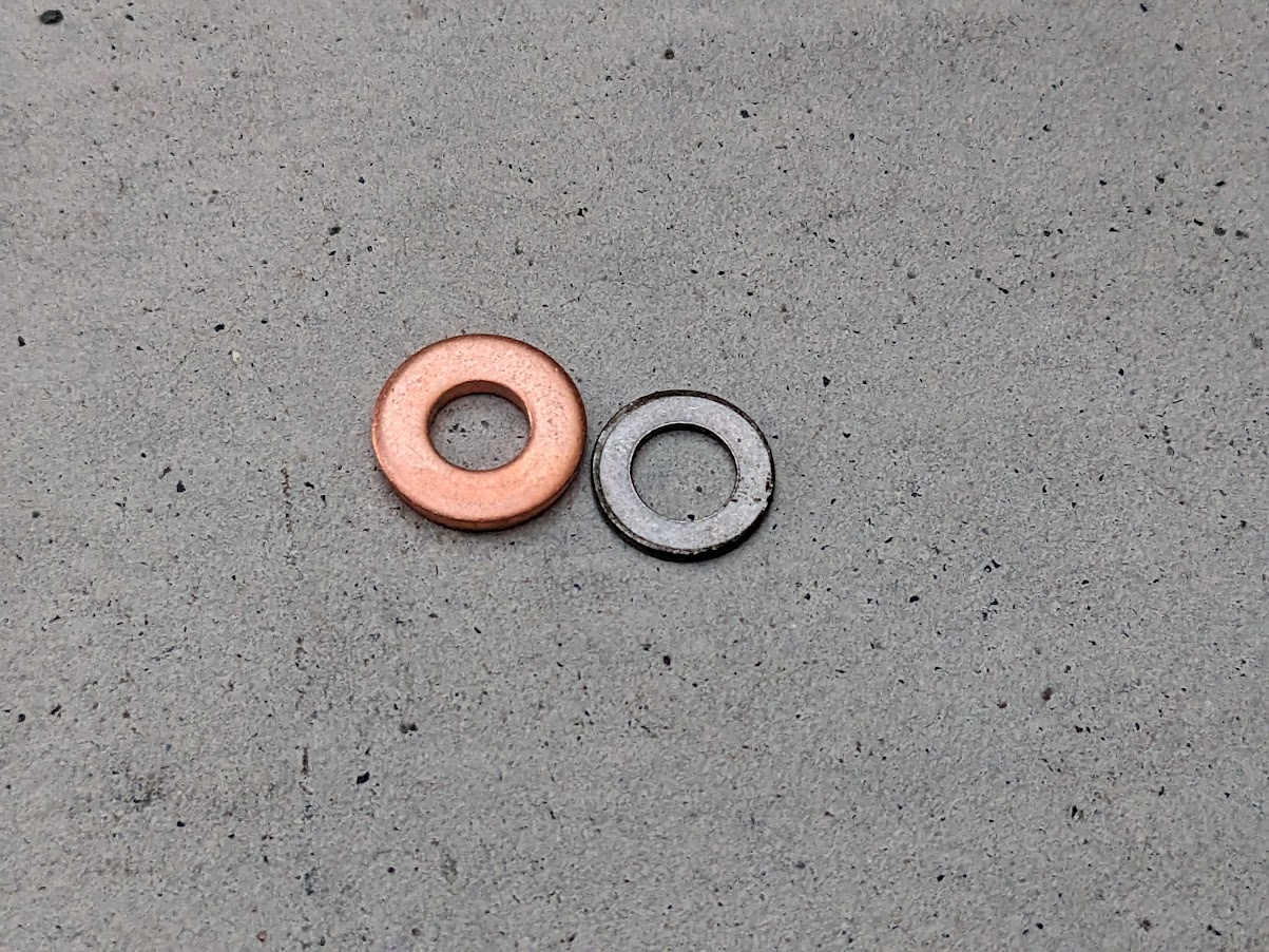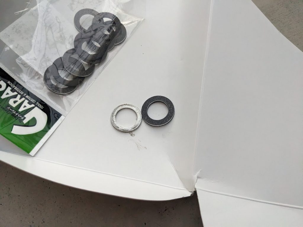 交換前と交換後のワッシャー比較。外径サイズがオリジナルよりかなりデカいが問題無く装着できた。
