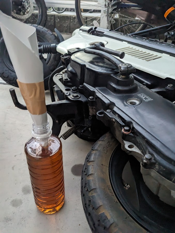 下部にあるドレンボルトを取るとドス黒いオイルがだだ漏れてきます。写真忘れたけどヤフオク商品の緩衝材と段ボールで作ったバイク用オムツに排出した。そのまま可燃ごみに出せるので便利。