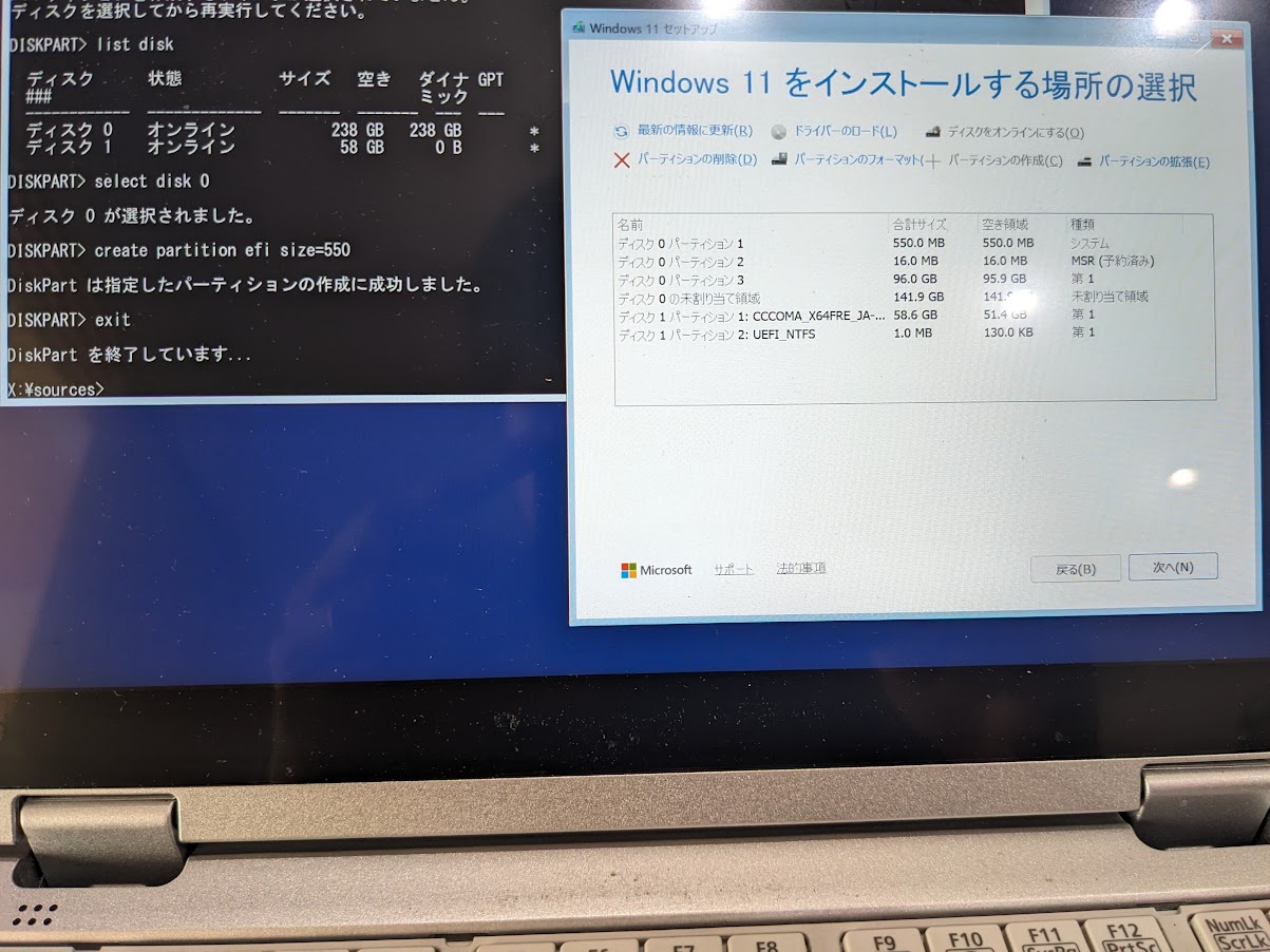 diskpart実行list diskでディスク一覧出して該当ディスクをselect disk Xで選択create partition efi size=550でEFIパーティション作成 (550MBは適当。 linux boot用設定も入るので)exitで終わり