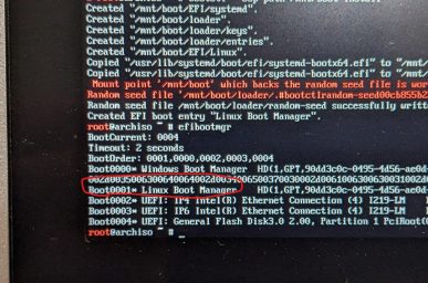 インストールできたらそのまま efibootmgr を実行して確認。Linux Boot Managerかくにん!よかった。