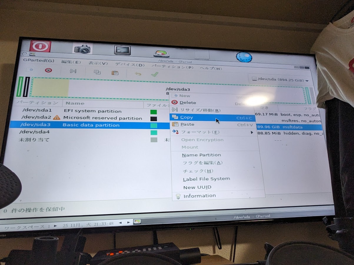SSD->SSDをパーティションごとコピーします。ddでやってもいいけどGparted Liveのイメージ入ったUSBメモリ残したまんまなのでせっかくなのでコレ使います。