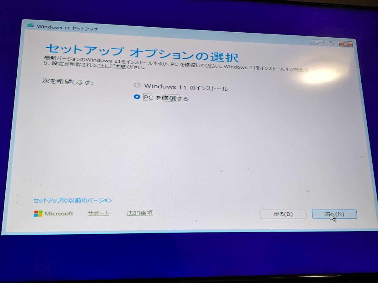 win11の起動USBメモリ作って”PCを修復する”から「起動オプションの修復」?的なメニューをダメ元でやってみます。失敗。ちゃんと手動で修復しましょうね。