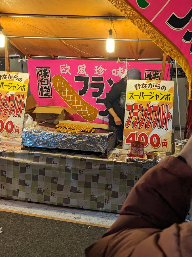 衛生観念度外視チャプ付けケチャップフランクフルト定期。これを見にえべっさん来てる。